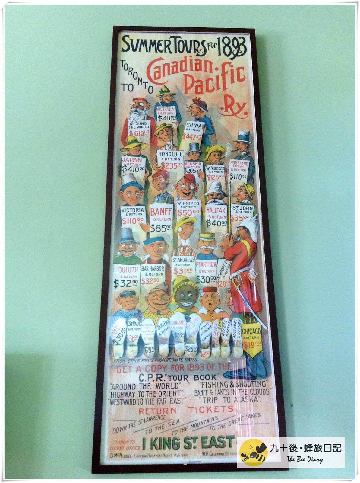 在這幅海報可以看到在1893年由多倫多到不同地方的費用。 到中國要$447.5加元,大約三千元港元,看似很少,但不要忘記是一百多年前的物價啊!